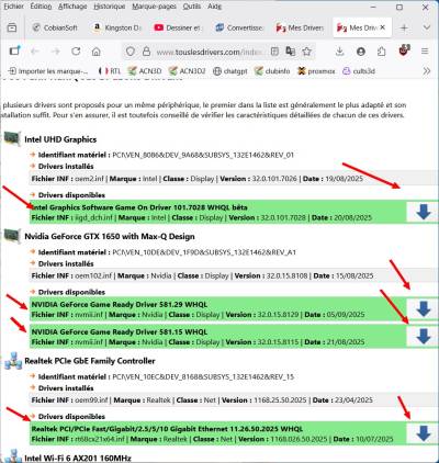 - Les parties en vert indique les pilotes qui ne sont pas a jour, clic sur la flèche en bleu pour télécharger le nouveau pilote, qui se trouvera dans le dossier “Téléchargement”.